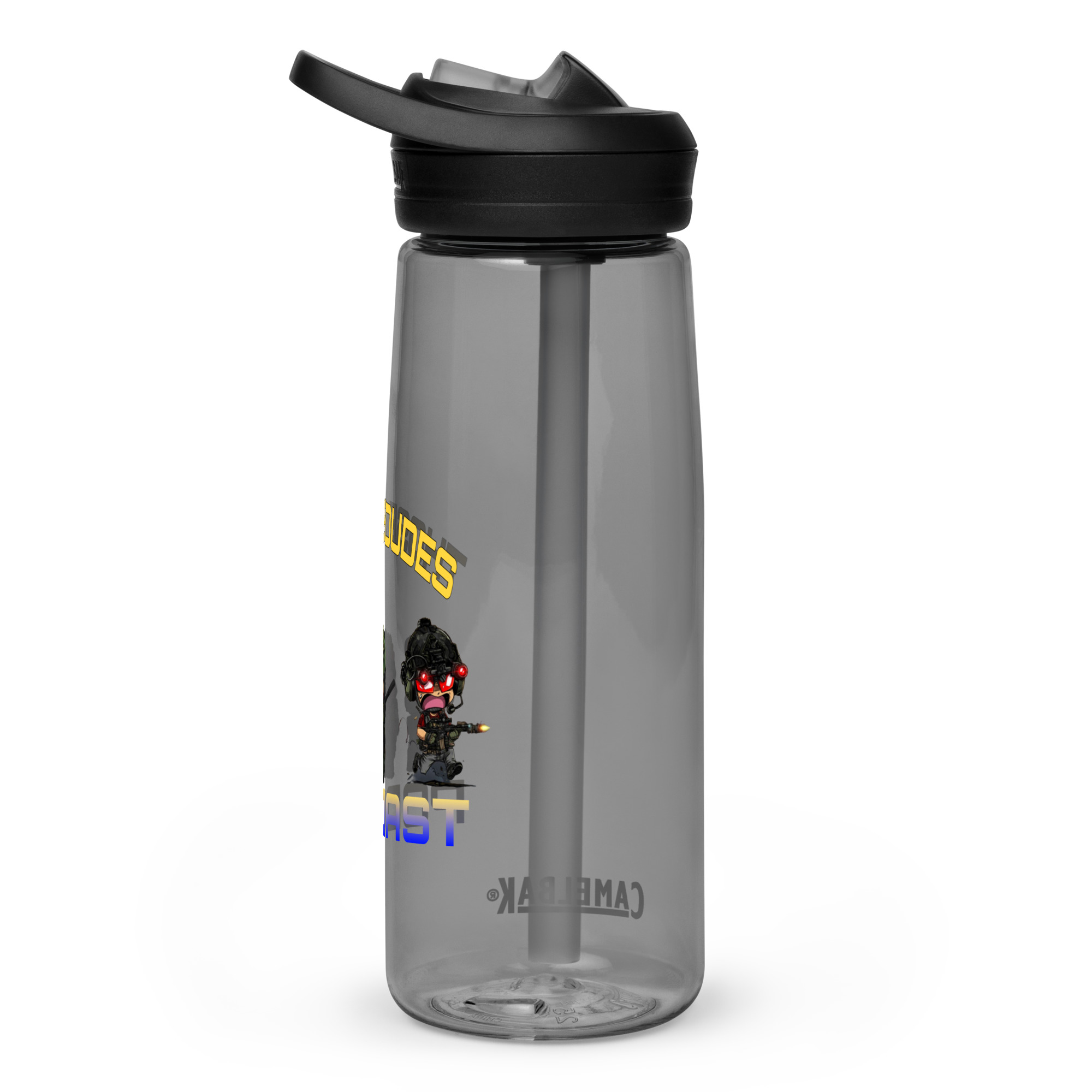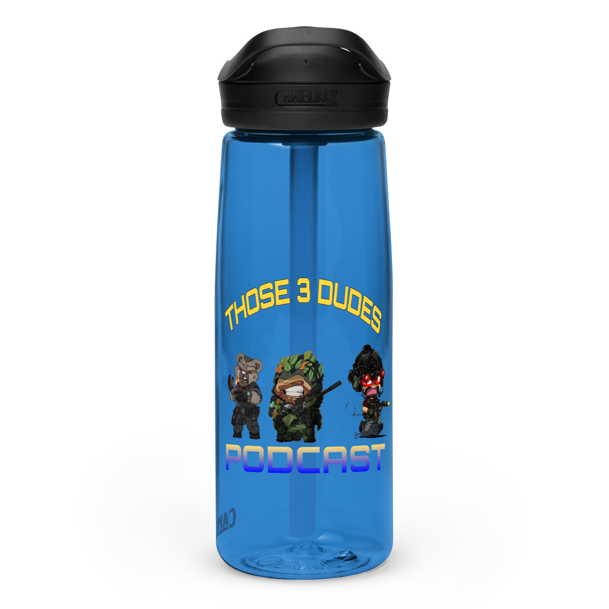 A Camel-Bak water battle with the Those 3 Dudes Tacti-toon logo on it. Take it it the beach, gym, office, or where ever you want and represent the Dudes while you do. This sports water bottle is made from 50% recycled plastic. Resistant to stains, shattering, and odors, it keeps your drinks fresh, and the spill-proof lid and bite valve prevent leaks. This bottle’s extra large size is also suitable for any long gym, work, or study sessions!